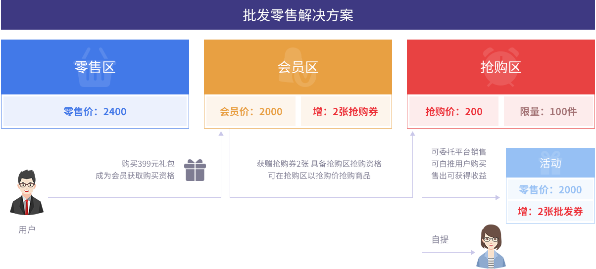 用户社交裂变新模式,用户购买商品可享会员价、批发权、零售权,买、卖灵活选择。