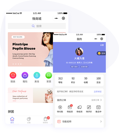 以移动应用云平台为依托,实现移动社交电商平台用户、财务、数据管理,社交营销卖货,团队管理等一体化系统解决方案。