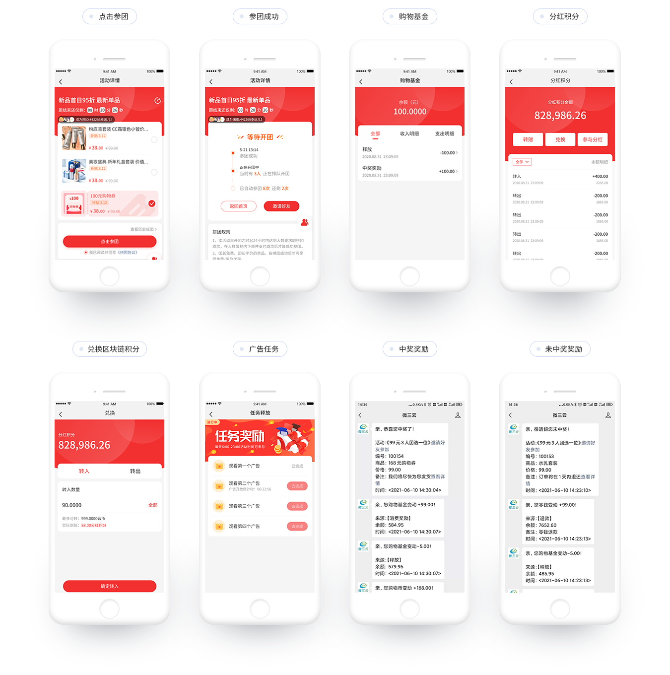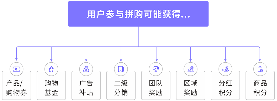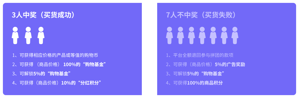 用户可自由参与不同价格(产品)的拼购活动,中奖后可自由选择产品或等值购物币。