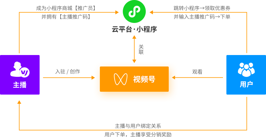 首创【主播推广码】功能,让主播与粉丝可以轻松建立销售关系,并结合【云平台】丰富的奖励机制,实现分销带货。